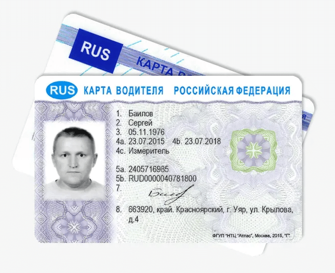 Это персональный пластиковый носитель, на котором записывается информация о перемещениях транспортного средства и действиях водителя на протяжении рабочей смены. По ней производится распознавание пользователя, допущенного к управлению ТС и к работе с контрольным прибором. На карте имеется фото владельца, его данные и сведения об организации-работодателе. Карта выдается только лично водителю.